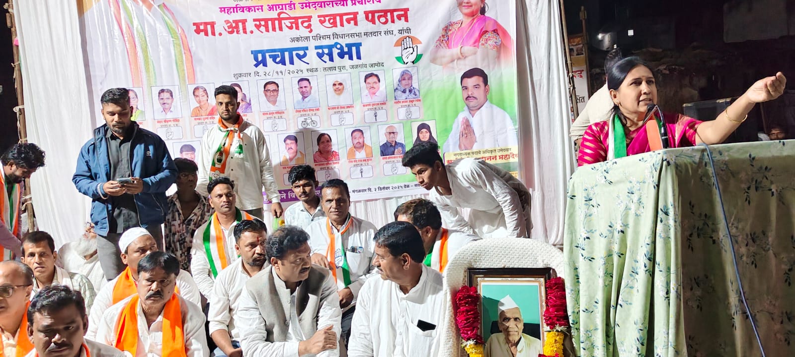 नगर परिषद जळगाव जामोद निवडणुकीच्या पार्श्वभूमिवर आज महाविकास आघाडी चे अधिकृत नगर अध्यक्ष पदाचे उमेदवार श्री सूर्यवंशी गजानन महादेव व महाविकास आघाडी चे सर्व नगर सेवक उमेदवारांच्या प्रचारार्थ काढण्यात आलेल्या पदयात्रा आणि जाहीर सभेला उपस्थित अकोला पश्चिम विधानसभा मतदार संघाचे आमदार साजिद खान पठाण ह्यांनी मतदारांशी स्नेहपूर्ण संवाद साधला जनतेच्या विश्वासाला पात्र ठरलेल्या कार्यक्षम प्रामाणिक आणि विकासाभिमुख उमेदवारांना आम्ही संधी दिली आहे येणाऱ्या जळगाव जामोद निवडणुकीत पंजा व महाविकास आघाडीतील उमेदवारांच्या चिन्हासमोरील बटन दाबून महाविकास आघाडीच्या सर्व उमेदवारांना भरघोस मतांनी विजयी करण्याचे आवाहन या जाहीर सभेत दरम्यान नागरिकांना करण्यात आले